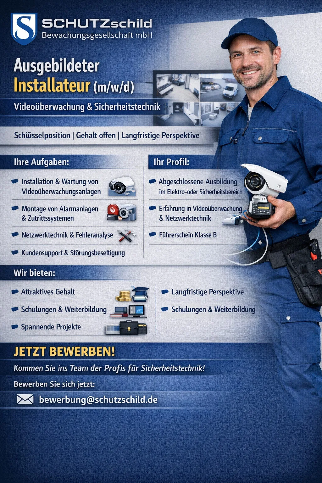 Die SCHUTZschild Bewachungsgesellschaft mbH sucht einen hochqualifizierten Installateur (m/w/d) für den Bereich Videoüberwachung, Alarmanlagen und Sicherheitstechnik.
