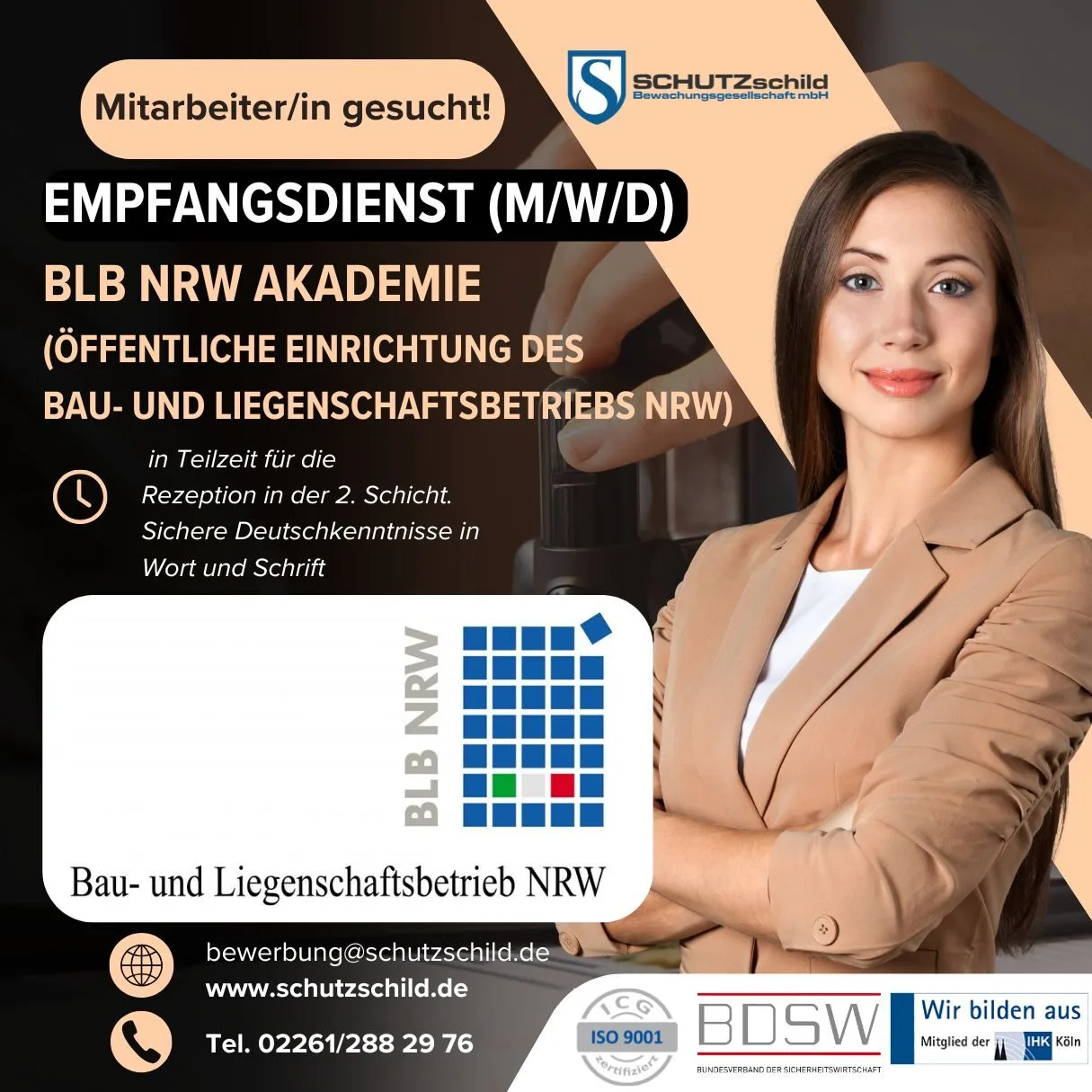 Zur Verstärkung unseres Teams in der BLB NRW Akademie (öffentliche Einrichtung des Bau- und Liegenschaftsbetriebs NRW) suchen wir eine:n zuverlässige:n und freundliche:n Empfangsmitarbeiter:in (m/w/d) in Teilzeit für die Rezeption in der 2. Schicht.