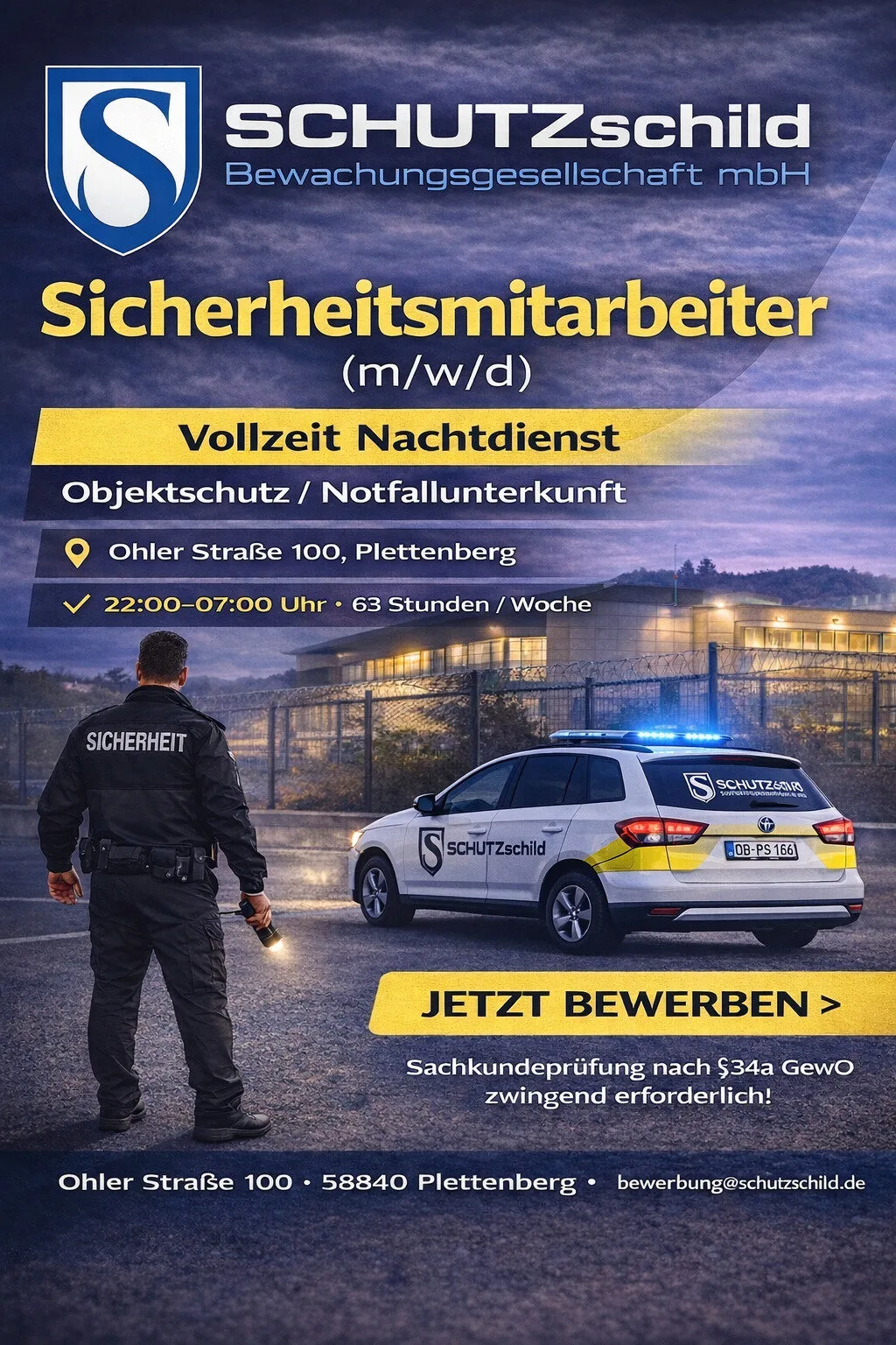 Dann freuen wir uns auf Ihre Bewerbung als Sicherheitsmitarbeiter (m/w/d) im Objektschutz / Notfallunterkunft.