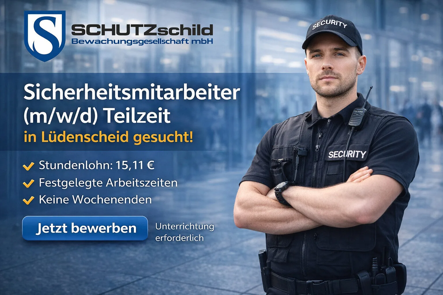 Zur sofortigen Einstellung suchen wir Sicherheitsmitarbeiter (m/w/d) in Teilzeit für einen festen Einsatz im Jobcenter Lüdenscheid!